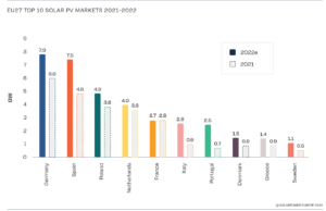 Hanno guidato la crescita Germania (8 GW nel 2022), seguita da Spagna (7,5 GW), Polonia (4,9 GW), Paesi Bassi (4 GW) e Francia (2,7 GW). L’Italia potrebbe chiudere l’anno con 2,6 GW di nuovi impianti fotovoltaici.