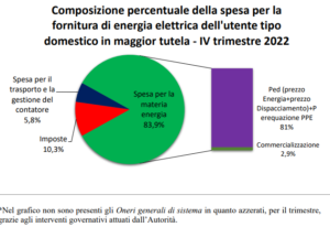 Per il quarto trimestre del 2022 Arera ha stabilito un aumento del 59% della bolletta della luce. Gli aumenti riguardano la famiglia tipo in tutela (cioè con consumi medi di energia elettrica di 2.700 kWh all’anno). La crescita del prezzo finale è legata all’aumento della voce energia, ed è appena contrastato dal calo, seppur limitato, della voce di dispacciamento (-0,6%). Per la bolletta elettrica la spesa per la famiglia tipo nel 2022 sarà di circa 1.322 euro. Il dato segna una crescita del 109% rispetto ai 632 euro del 2021.