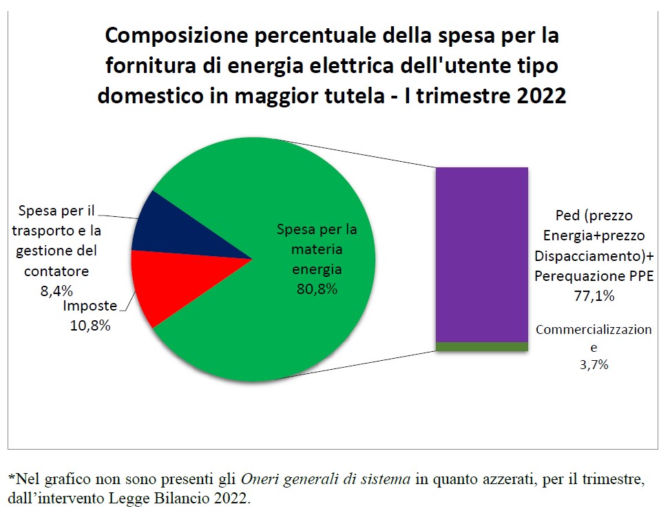 I nuovi straordinari record al rialzo dei prezzi dei prodotti energetici all’ingrosso (quasi raddoppiati nei mercati spot del gas naturale e dell’energia elettrica nel periodo settembre-dicembre 2021) e dei permessi di emissione di CO2, avrebbero portato ad un aumento del 65% della bolletta dell’elettricità e del 59,2% di quella del gas. Per attenuare questo impatto, l’Autorità ha confermato l’annullamento transitorio degli oneri generali di sistema in bolletta e potenziato il bonus sociale alle famiglie in difficoltà. Con la Legge Bilancio 2022, il Governo ha infatti stanziato circa 3,8 miliardi di euro per il contenimento della bolletta delle famiglie e delle microimprese, allocando 1,8 miliardi di euro alla riduzione degli oneri generali di sistema per l’elettricità e 480 milioni per quelli gas nel prossimo trimestre, oltre a 912 milioni destinati al potenziamento dei bonus.