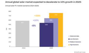 SolarPower Europe stima infatti 655 GW di nuova potenza installata, con una crescita del 10% rispetto allo scorso anno. Da sola, la Cina dovrebbe coprire il 53% della nuova potenza, mentre l’Europa solo il 13%. Lo scorso anno, i Paesi dell’Unione europea hanno totalizzato 65,5 GW, con un aumento del 4% rispetto al 2023, mentre per il 2025 sono previsti 75 GW (+7%) grazie soprattutto alla crescita di progetti su larga scala.