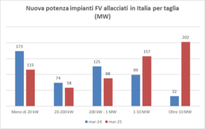 Ancora in calo le taglie residenziale e commerciale: da inizio anno, le installazioni di potenza fino a 20 kW hanno registrato una flessione del 38% rispetto al primo trimestre del 2024. In calo anche la taglia compresa tra 20 e 200 kW (-25%) e tra 200 kW e 1 MW (-36%). È possibile tuttavia notare un dato incoraggiante: si è infatti arrestato il calo degli allacci in ambito residenziale iniziata con la fine del Superbonus.