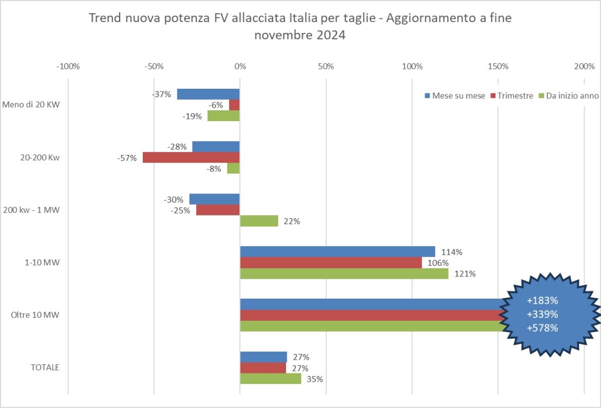 Nel mese di novembre 2024 la nuova potenza fotovoltaica allacciata in Italia è stata di 626,4 MW. Il dato, il più alto insieme a quello di gennaio, segna un incremento del 27% rispetto ai 492 MW dello stesso mese del 2023. Continua tuttavia il calo del numero dei nuovi impianti allacciati, con una flessione del 38% rispetto a novembre 2023. La crescita della potenza è legata ancora una volta al contributo della taglia utility scale: si segnala infatti l’entrata in funzione di tre impianti di potenza superiore a 10 MW, per un totale di 254,3 MW. A questi si aggiungono 48 nuovi impianti di taglia compresa tra 1 e 10 MWp per una potenza totale di 145 MW.