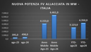 Da gennaio ad agosto 2024 la nuova potenza fotovoltaica allacciata in Italia è stata di 4,35 GW. Il dato segna una crescita del 39% rispetto allo stesso periodo del 2023 (3,12 GW). È quanto emerge dall’ultima release di Terna sul nuovo fotovoltaico in Italia.