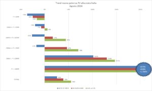 Complessivamente, a fine agosto 2024 si contavano in Italia 1,8 milioni di impianti fotovoltaici per una potenza cumulata di 34,6 GW.