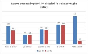 Continua invece la crescita delle installazioni di potenza compresa tra 1 e 10 MW, con un incremento del 18% da inizio anno. Gli impianti di potenza superiore ai 10 MW registrano invece una flessione del 15% da gennaio ad agosto 2025 e un calo dell’89% nel confronto tra agosto 2025 e agosto 2024, quando in Italia erano entrati in funzione sei nuovi impianti per 155 MW. Ad agosto 2025 si segnala solo un parco fotovoltaico, per una potenza di 18 MW.