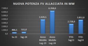 Entrando nel dettaglio, a luglio 2024 sono entrati in esercizio 511 MW di nuove installazioni fotovoltaiche, in linea con il mese precedente. Si conferma ancora una volta il calo del numero dei nuovi impianti allacciati, con una flessione del 24% rispetto a luglio 2023.