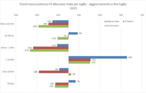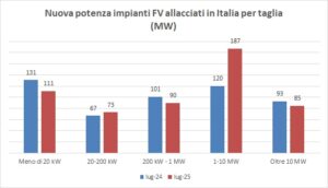 Ancora una volta si registra una flessione delle taglie residenziale e commerciale. Da inizio anno, le installazioni di potenza fino a 20 kW hanno registrato un calo del 29% rispetto allo stesso periodo del 2024. Tuttavia, a luglio in ambito domestico si registra una lieve ripresa rispetto a giugno 2025, mese che aveva registrato il dato più basso da inizio anno con 95 MW. Analizzando le installazioni di taglia commerciale e industriale, invece, nel confronto tra i primi sette mesi del 2025 e lo stesso periodo del 2024 cala ancora la taglia compresa tra 20 e 200 kW (-11%). Anche in questo caso, però, arrivano segnali incoraggianti: a luglio 2025 la nuova potenza allacciata registra un incremento del 9% rispetto a luglio 2024. Ancora in forte calo, invece, la taglia di potenza compresa tra 200 kW e 1 MW (-37%).