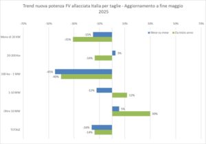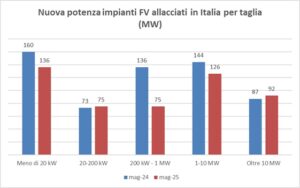 Analizzando le installazioni commerciali e industriali, invece, nel confronto tra i primi cinque mesi del 2025 e lo stesso periodo del 2024 cala ancora la taglia compresa tra 20 e 200 kW (-14%), anche se si registra un timido incremento tra maggio 2025 e maggio 2024 (+3%). Ancora in forte calo, invece, la taglia di potenza compresa tra 200 kW e 1 MW (-40%).