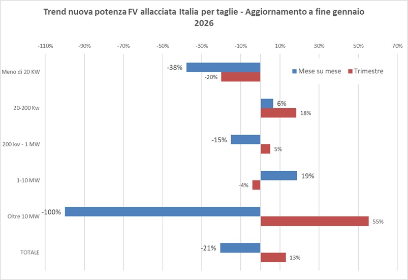 In leggera ripresa, invece, le installazioni di potenza compresa tra 20 e 200 kWp, che con 57 MW di nuovo fotovoltaico connesso segnano un +6% rispetto a gennaio 2025 e +18% nell’ultimo trimestre. Parte bene anche la taglia compresa tra 1 e 10 MW.