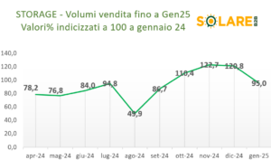 L’andamento indicizzato rivela che i volumi di vendite di sistemi di accumulo sono tornati sotto il livello che abbiamo preso come riferimento (gennaio 2024). Anche in questo caso è un piccolo rallentamento legato alla stagionalità di gennaio dopo che negli ultimi tre mesi del 2024 i volumi avevano mostrato buoni andamenti raggiungendo anche valori tra i più alti dell’ultimo anno.