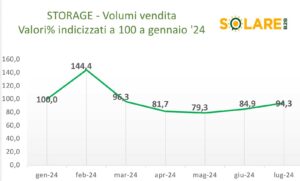Per quanto riguarda invece i sistemi di accumulo, continua la lenta ripresa delle vendite: i volumi di luglio sono in crescita del 10% rispetto a giugno, anche se molto lontani dal mese record di febbraio. Nel confronto fra trimestri, resta molto alta la contrazione per quanto riguarda il totale vendite storage (-19,8%).