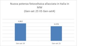 Nei primi nove mesi del 2025 la nuova potenza fotovoltaica allacciata in Italia è stata di 4 GW. Il dato segna una flessione del 16% rispetto ai 4,8 GW dello stesso periodo del 2024. Considerando solo il mese di settembre, invece, sono stati allacciati 398 MW. In questo caso il dato segna una flessione del 22% rispetto a settembre 2024.