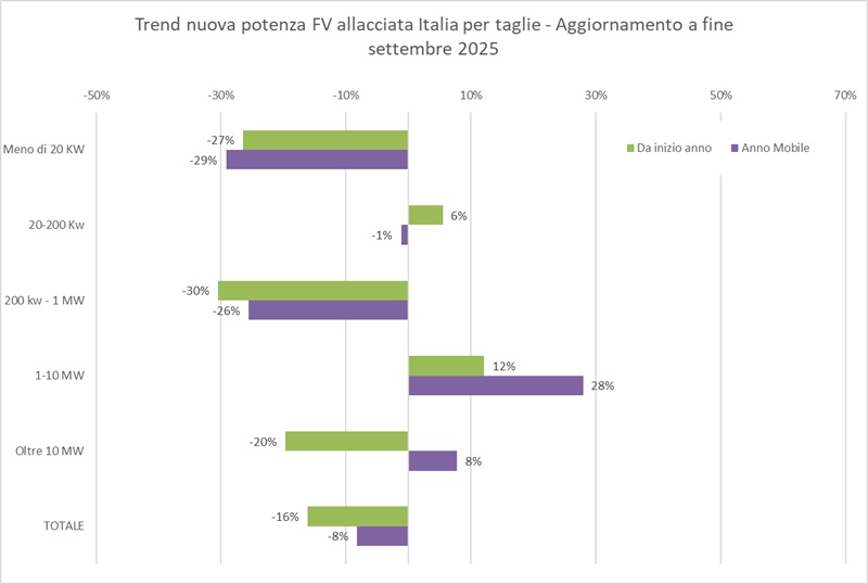 Nei primi nove mesi del 2025 la nuova potenza fotovoltaica allacciata in Italia è stata di 4 GW. Il dato segna una flessione del 16% rispetto ai 4,8 GW dello stesso periodo del 2024. Considerando solo il mese di settembre, invece, sono stati allacciati 398 MW. In questo caso il dato segna una flessione del 22% rispetto a settembre 2024.