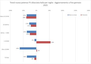 A gennaio 2025 la nuova potenza fotovoltaica allacciata in Italia ha raggiunto 419 MW. Il dato segna un calo del 36% rispetto ai 656 MW dello stesso periodo del 2024. Diminuisce anche il numero dei nuovi impianti allacciati, con una flessione del 38%. Analizzando le singole taglie, nel mese di gennaio 2025 si registra un calo delle nuove connessioni in tutti i segmenti di mercato, dal residenziale all’utility scale.