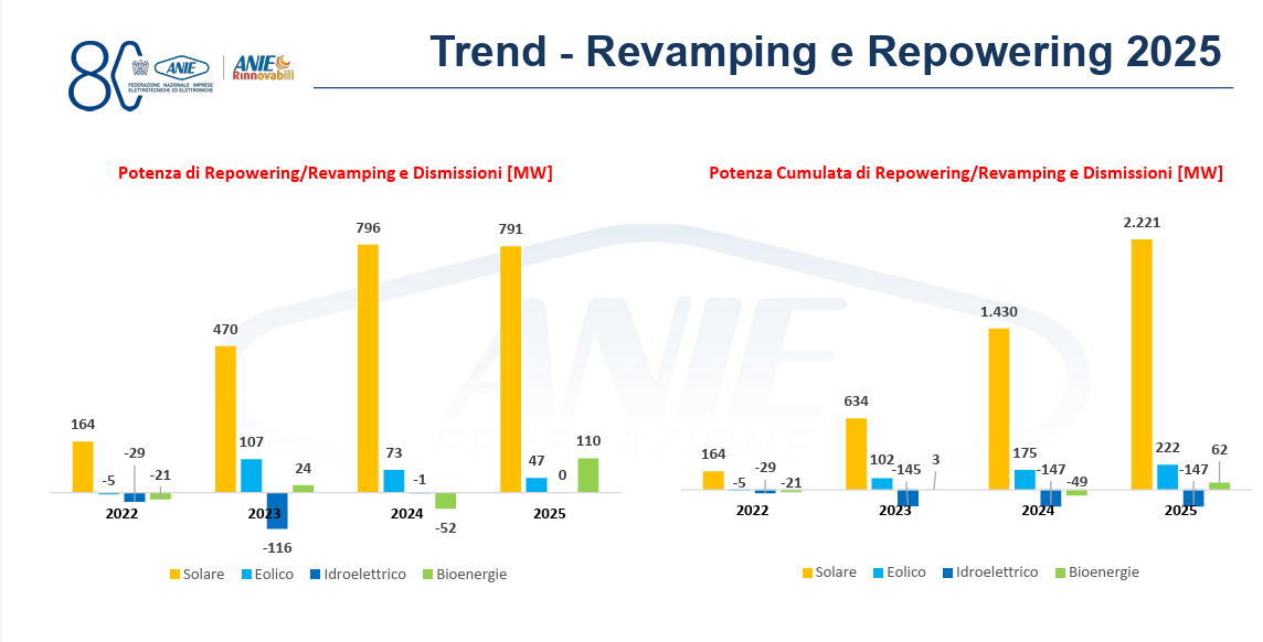 “Il consolidamento della transizione energetica in Italia non passa solo dalla nuova capacità installata, ma anche dalla gestione del parco impianti esistente”, si legge in una nota di Anie. “Le attività di repowering e le dismissioni hanno assunto un ruolo centrale nel 2025, anno in cui la potenza complessivamente oggetto di interventi di potenziamento ha raggiunto la quota significativa di quasi 1 GW. I dati del 2025 dimostrano come il mercato si stia spostando con decisione verso una manutenzione evolutiva che mira a massimizzare la resa energetica del parco esistente”.