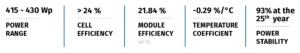 Il prodotto raggiunge una potenza di 425 Wp nella versione con backsheet nero e 430 Wp nella versione bianca. Inoltre, il modulo può raggiungere un’efficienza di conversione massima del 21,84%.