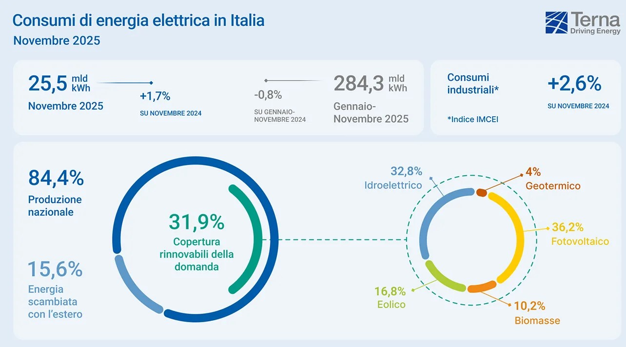 Il fotovoltaico ha coperto l’8,9% della domanda complessiva di energia elettrica (25.548 GWh) e il 10,57% della produzione (21.567 GWh). Sempre restando sul mese di novembre, la domanda di energia elettrica italiana, in lieve crescita rispetto a novembre 2024 (+1,7%), è stata soddisfatta per l’84,4% dalla produzione nazionale e per la quota restante dal saldo dell’energia scambiata con l’estero. Le fonti rinnovabili hanno coperto il 31,9% della domanda elettrica (era il 33,9% a novembre 2024). In aumento a due cifre la produzione da fotovoltaico (+23,7%); cresce anche la produzione da fonte termica (+4,4%), eolica (+2,3%) e geotermica (+1,9%), mentre cala la produzione da fonte idrica (-21,5%).