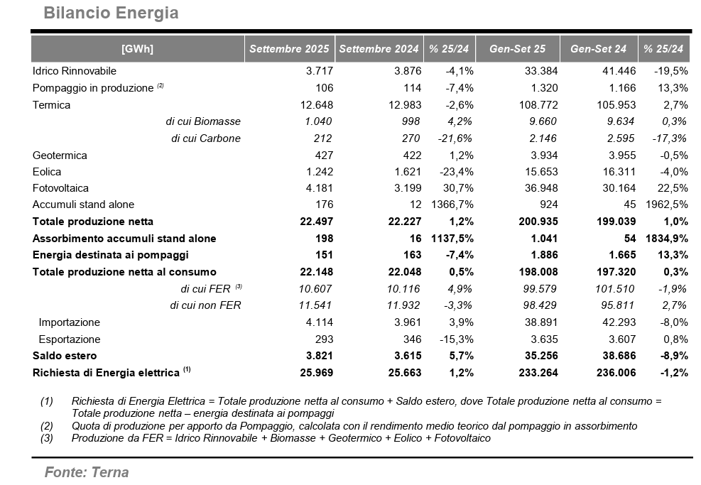 Il fotovoltaico ha coperto il 16% della domanda complessiva di energia elettrica (25.969 GWh) e il 18,58% della produzione (22.497 GWh). Sempre a settembre la domanda di energia elettrica italiana, che segna un leggero incremento dell’1,2%, è stata soddisfatta per l’85,3% dalla produzione nazionale e per la quota restante dal saldo dell’energia scambiata con l’estero. Le fonti rinnovabili hanno coperto il 40,9% della domanda elettrica (era il 39,4% a settembre 2024). In aumento a due cifre la produzione da fotovoltaico. In diminuzione le fonti idrica (-4,1%), eolico (-23,4%) e termica (-2,6%). Secondo quanto emerge dalle stime di Terna, infine, considerando tutti i nuovi impianti da rinnovabili, da gennaio a settembre la nuova capacità in esercizio è aumentata di 4.476 MW, di cui 4.078 MW di fotovoltaico.
