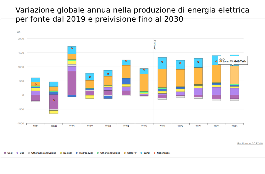 Tra il 2026 e il 2030, la produzione globale di energia elettrica da fonti rinnovabili dovrebbe crescere di circa 1.000 TWh all’anno, con il solo fotovoltaico a rappresentare oltre 600 TWh annui.