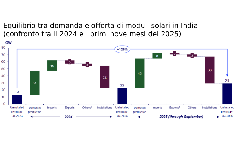 La capacità produttiva di moduli fotovoltaici in India è destinata a raggiungere i 125 GW entro la fine del 2025, superando di oltre tre volte la domanda interna che si attesta a circa 40 GW.