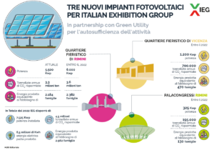 Italian Exhibition Group (IEG), gruppo fieristico e congressuale, ha commissionato alla società Green Utility la realizzazione di tre nuovi impianti fotovoltaici sulle proprie strutture espositive di Rimini e Vicenza, nonché sul palacongressi riminese.