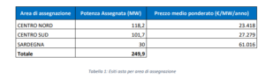 Nello specifico, Terna ha assegnato 118,2 MW al Centro Nord a un prezzo medio ponderato di circa 23.500 euro al MW/anno; 101,7 MW al Centro Sud a un prezzo medio ponderato di circa 27.300 euro al MW/anno; 30 MW in Sardegna ad un prezzo medio ponderato di circa 61.000 euro al MW/anno.