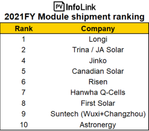 A pochi giorni dalla pubblicazione della classifica di PV Tech, anche il centro di ricerca PV InfoLink conferma Longi Solar come primo produttore di moduli fotovoltaici nel 2021.