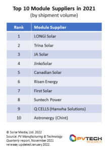 Nel 2021 è Longi Solar il primo produttore di moduli a livello globale. È quanto emerge dalla classifica pubblicata ieri, giovedì 13 gennaio, da PV Tech. Seguono Trina Solar al secondo posto, JA Solar e JinkoSolar.