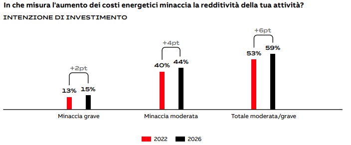 Rispetto alla media globale, l’Italia mostra un onere medio dei costi energetici (24% contro il 25% globale), una percezione della minaccia alla redditività leggermente sotto la media (54% contro 59% globale) e una preparazione all’uso di strumenti digitali per la gestione energetica inferiore alla meda (59% contro 67% globale).