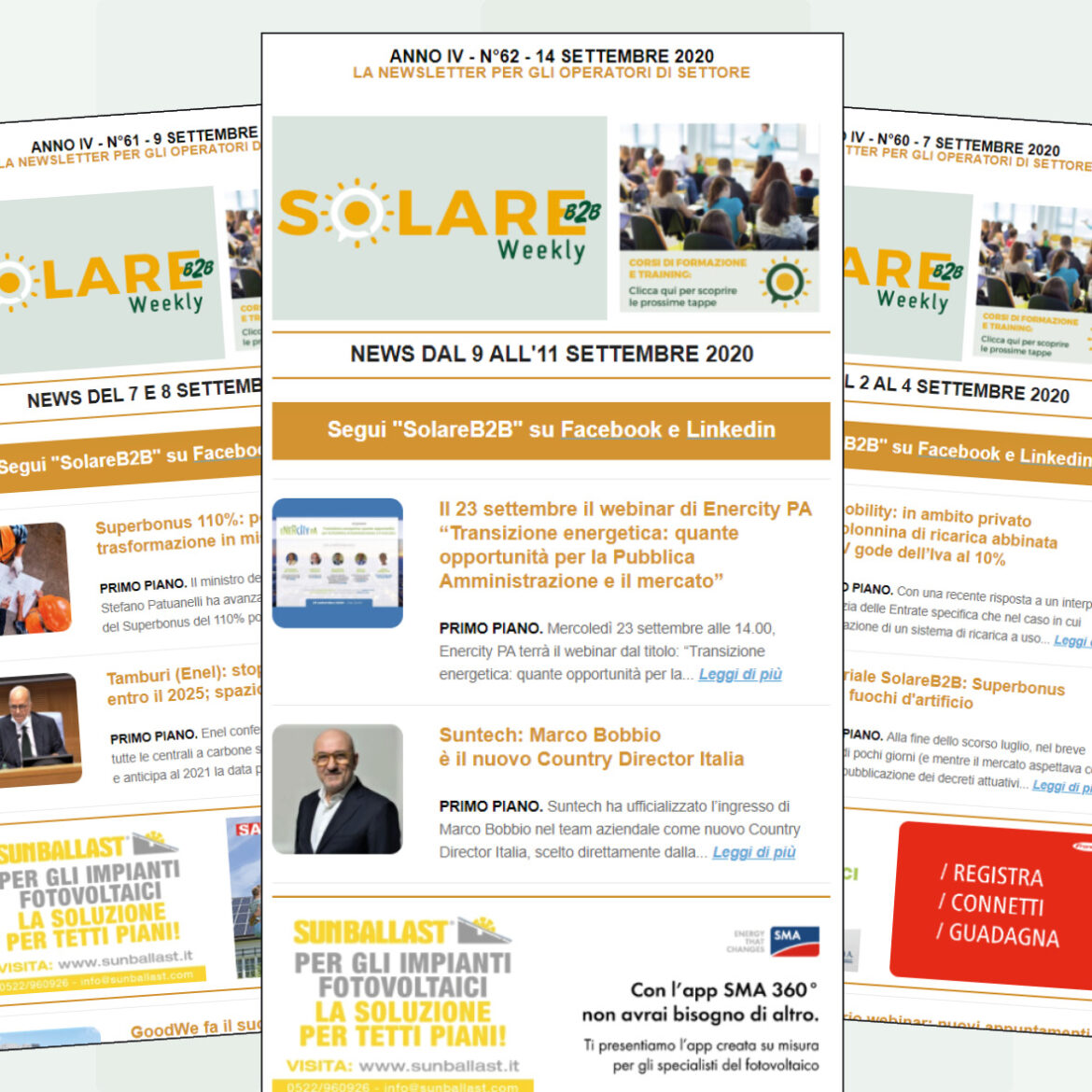 È disponibile l’ultimo numero della newsletter SolareB2B Weekly, che ogni settimana raccoglie le notizie del mercato del fotovoltaico e dell’efficienza energetica.