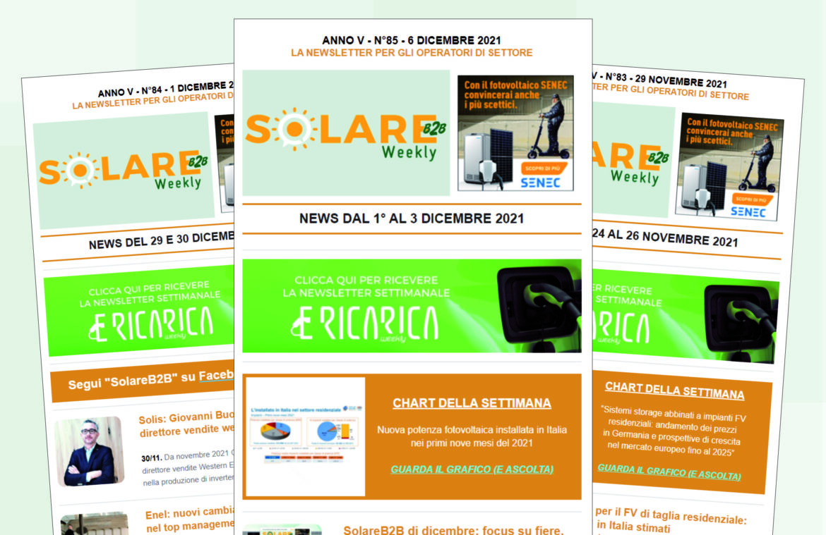 Seguono le news sul nuovo numero di dicembre di SolareB2B, sulle stime di IEA relative alla nuova potenza fotovoltaica installata a livello globale nel 2021, e sul rapporto di Enea che analizza il numero di impianti fotovoltaici che hanno beneficiato delle detrazioni fiscali nel corso del 2020.