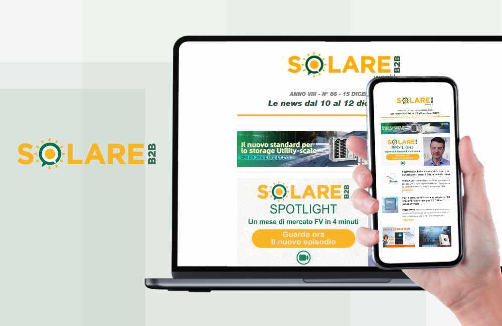 È disponibile il nuovo numero della newsletter SolareB2B Weekly, che ogni settimana propone le principali notizie del mercato del fotovoltaico e dell’efficienza energetica. In apertura la nuova puntata di Spotlight, la video rubrica mensile di SolareB2B sul mercato del fotovoltaico.