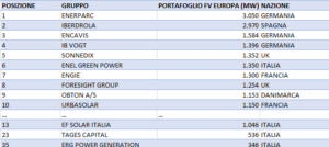 Entrando nel dettaglio del report di Solarplaza, è la società tedesca Enerparc AG a detenere il più ampio portfolio di impianti fotovoltaici in Europa, con 3,05 GW, seguita da Iberdrola (2,9 GW) ed Encavis (1,6 GW).