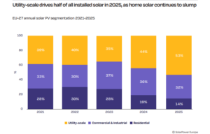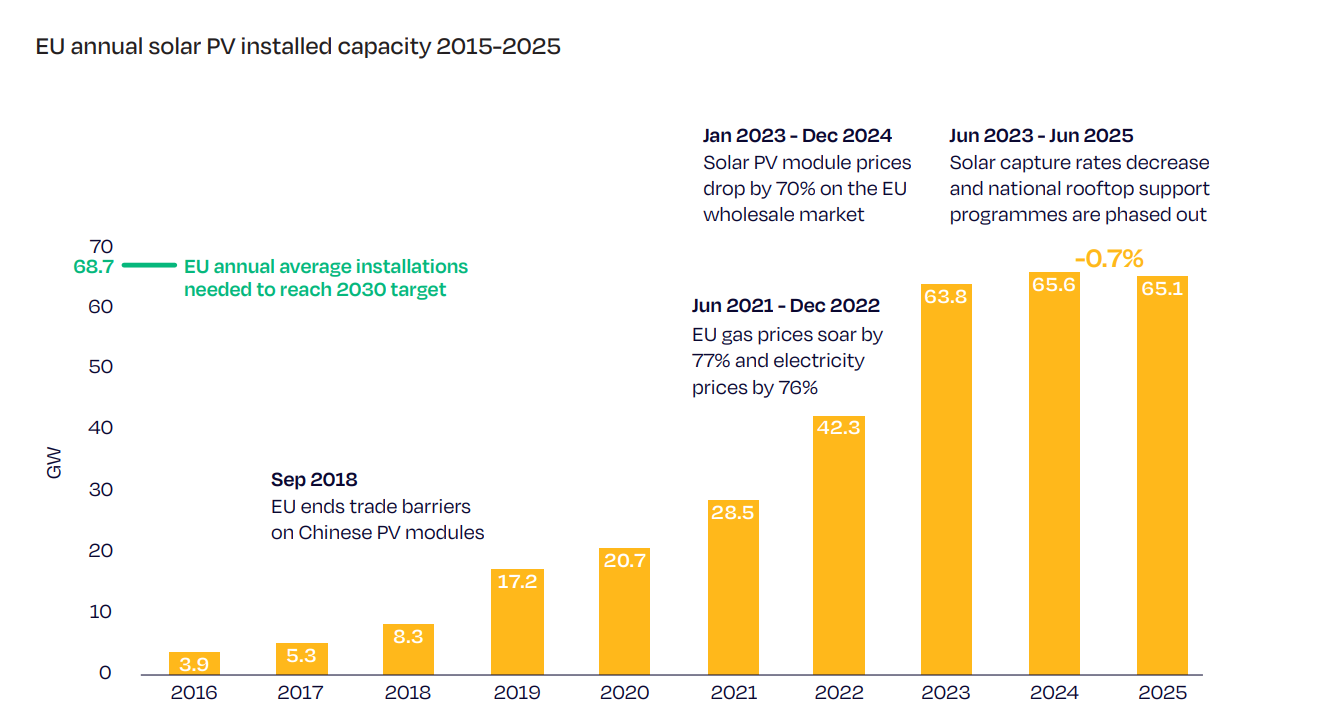 SolarPower Europe: per il 2025 in UE stimata nuova potenza FV installata di 65,1 GW (-0,7%)
