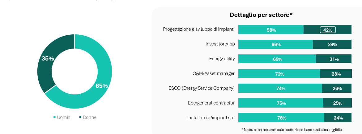 Secondo i partecipanti all’indagine di Italia Solare, le donne rappresentano il 35% dei dipendenti del comparto. Poco più di una donna su quattro (28%) opera nell’area tecnica, mentre il 72% è impiegato in altre funzioni aziendali, con una maggiore presenza nell’area Amministrazione (27%). Sul fronte delle posizioni apicali, il report evidenzia una presenza femminile ancora contenuta seppur in linea con i trend di altri settori: il 67% delle aziende ha almeno una donna in posizioni di vertice, mentre il 33% non ne ha nessuna. Se il dato a livello aggregato è positivo, nel momento in cui ci si concentra sulla leadership femminile la quota si assottiglia decisamente: solo 1 azienda su 10 dichiara di avere una donna come AD, DG o amministratrice unica, mentre il 4% segnala una presenza femminile nei ruoli di presidente o vicepresidente.