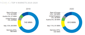 L’Italia si collocherebbe così al secondo posto dei primi quattro mercati europei dopo Germania (542 MWh) e prima di Austria (39 MWh) e Regno Unito (36 MWh). Il nostro Paese dovrebbe così coprire l’11% delle nuove installazioni in Europa, che dovrebbero attestarsi attorno agli 810 MWh (+8% rispetto ai 745 MWh del 2019).