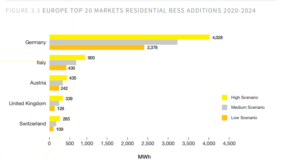 Sempre in merito all’Italia, il report fornisce anche stime sul lungo periodo. Lo studio considera tre scenari: low, medium e high. Nel primo, sono previsti 430 MWh di nuovi sistemi di accumulo entro il 2024, mentre nello scenario medio 671 MWh. Nello scenario high, infine, si prevedono 900 MWh nei prossimi quattro anni.