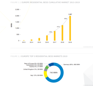 Analizzando i singoli Paesi, nel 2019 è la Germania a coprire la fetta più importante dell’installato con due terzi del totale (496 MWh, +75% sul 2018), seguita da Italia (89 MWh, +16%), Regno Unito (38 MWh, +6%), Austria (37 MWh, +23%) e Svizzera (20 MWh, +43%). I cinque Paesi hanno coperto il 90% dei nuovi sistemi installati in Europa.
