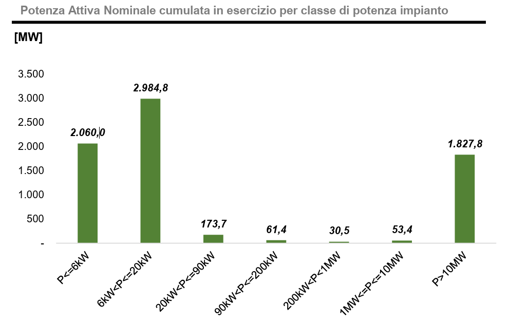 Poco più di 1,8 GW di potenza fa riferimento a sistemi di storage di potenza superiore ai 10 MW. La classe di potenza più importante in termini di connessioni resta ancora una volta quella compresa tra 6 e 20 kW. Questa taglia corrisponde a circa 2,9 GW (41,5% del totale).