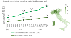 Nei primi otto mesi del 2025 sono stati connessi in Italia nuovi sistemi di storage per una potenza di 1.461 MW. Il dato segna una flessione dell’1,9% rispetto ai 1.489 MW connessi nello stesso periodo del 2024.
