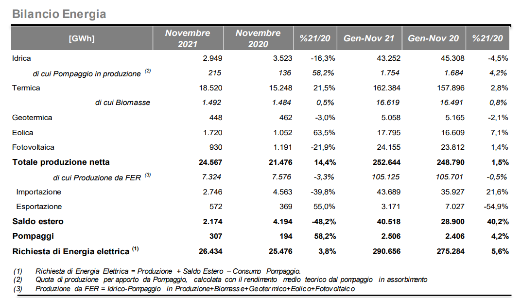 La produzione nazionale netta (24,3 miliardi di kWh) ha registrato una crescita del 14,4% rispetto a novembre del 2020. Le fonti rinnovabili hanno coperto complessivamente il 28% della domanda mensile. In aumento le fonti di produzione termoelettrica (+21,5%) ed eolica (+63,5%); in flessione tutte le altre (idroelettrica -16,3%; fotovoltaica -21,9%; geotermica -3%).