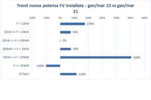 Bene anche la taglia di impianti fino a 12 kW, che con 168 MW registrano una crescita del 176% rispetto allo stesso periodo del 2021. Restando nell’ambito degli impianti residenziali, cresce anche la taglia compresa tra 12 e 20 kWp, con un +74%. Infine, considerando la taglia commerciale e industriale, nei primi tre mesi del 2022 sono stati realizzati 73,9 MW di impianti con potenza compresa tra 200 kWp e 1 MWp. Il dato segna una crescita del 76% rispetto al primo trimestre del 2021.